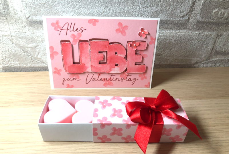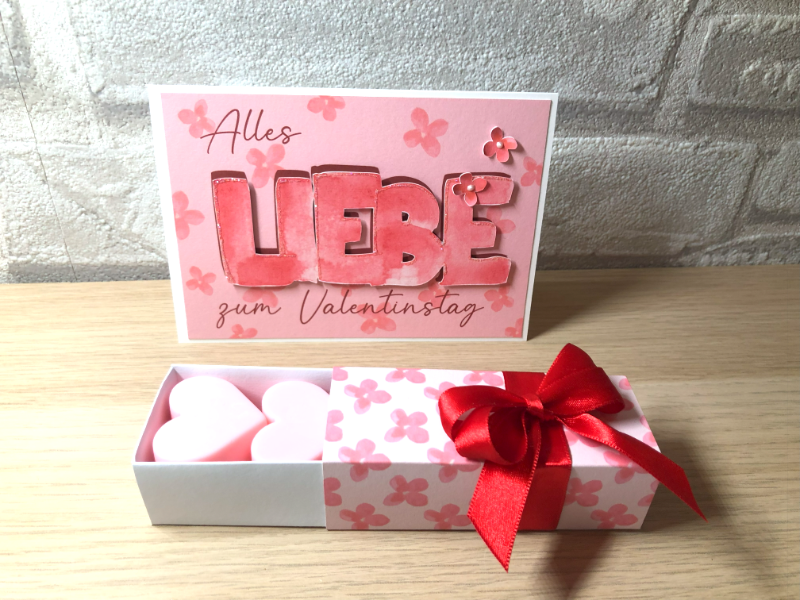 Passend dazu habe ich eine kleine Schubladenschachtel gebastelt, die ich mit ein paar duftenden selbstgegossenen Seifenherzchen gefüllt habe.