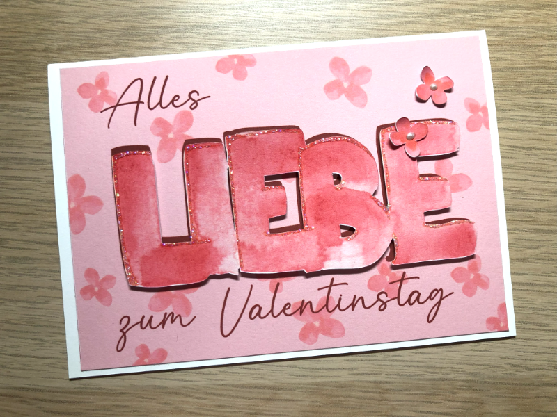 Ich liebe ja den Valentinstag und finde, daß man gar nicht genug Liebe verschenken kann! Deswegen hat die „Liebe“ hier auch den ganzen Platz auf dieser süßen Karte bekommen. Den Schriftzug und die Blümchen habe ich mit Aquarellfarben gemalt, anschließend eingescannt und mit dem Plotter, einem bißchen Glitzer und ein paar Extra-Blümchen in diese liebevolle Karte verwandelt.